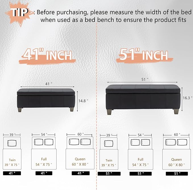 - OVERALL DEMENSION: The overall size of UDAX faux leather ottoman is 41‘*15.5’*14.8‘ and the inside storage dimension is 38.5’*12.5‘*7.5’. Our storage bench is wide enough to sit cozily and large enough to store your blanket, clothes, children's toys, and so on. It has plenty of space to help you organize every corner of your home.