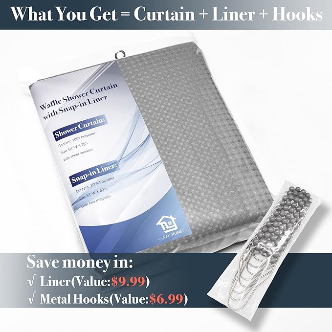 - Smart Design Set & Hotel Style: 54x78 Stall size waffle weave shower curtain with detachable liner, and free 12 rust resistant metal hooks set, the entire 3-in1 set offers a complete solution for bathtub or shower stall bathroom