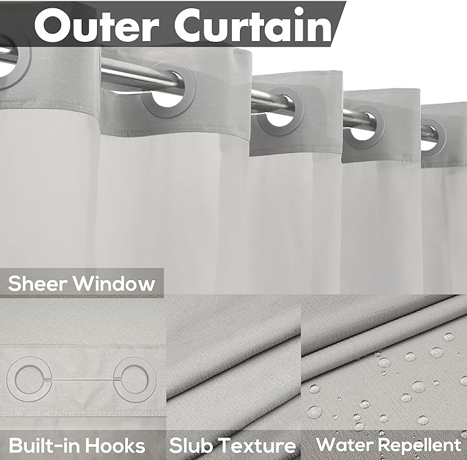 - Elegant & Durable: This slub textured fabric shower curtain with liner set is of hotel quality for long using, water resistant and quick to dry