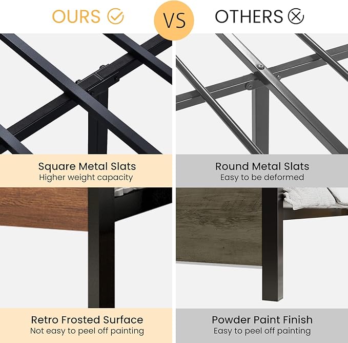 - Unique Design: The combination of rustic style headboard and footboard with retro frosted metal slats creates a strong industrial / rustic flair, adding an industrial and unique touch to your room. The headboard consists of a waterproof & scratchproof wood board