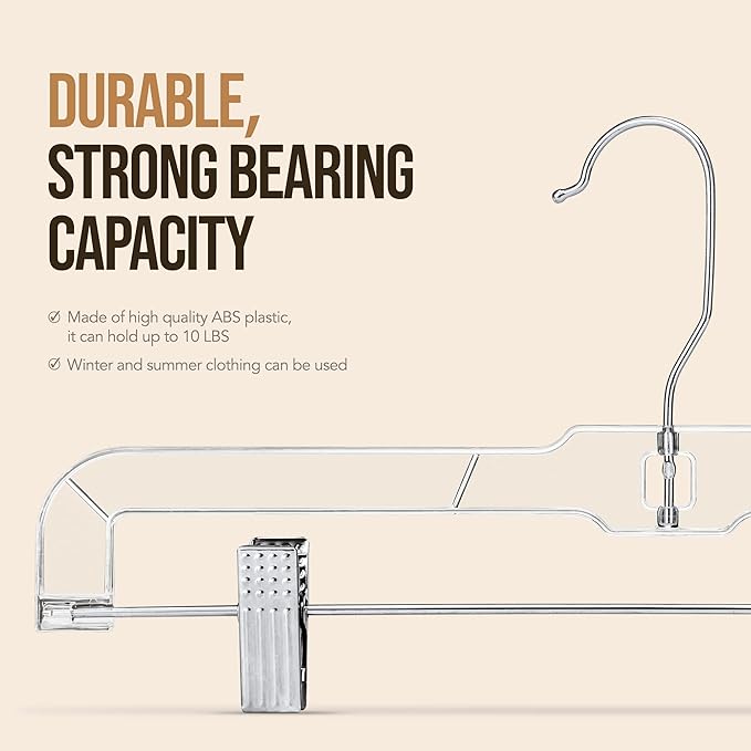 HOUSE DAY Clear Pants Hangers with Clips 12 Pack, Plastic Skirt Hangers for Women, 14 Inch Clip Hanger for Pants, Skirts, Jeans, Shorts, Legging, with 360-degree Swivel Hook, 2 Adjustable Clips