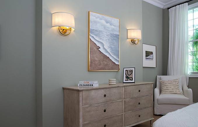 Yosoan Linen Fabric Cloth Boho Aged Brass Gold Wall Sconce Stairwell Fixture Light, 2-Light Dual Indoor Hardwired Vanity Vintage Wall Mount Lamp Antique Metal Base Semicircle Shade Lamp for Hallway
