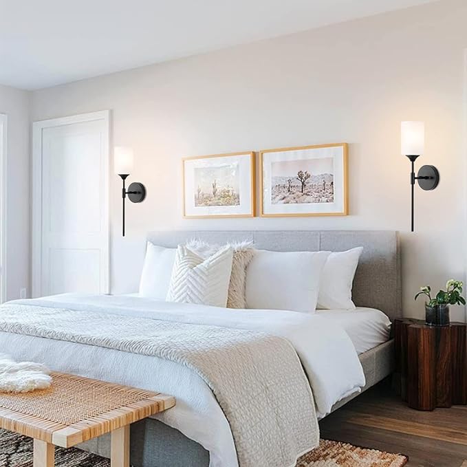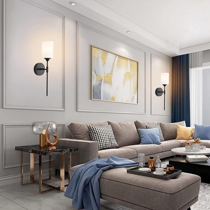 - 【Set of 2 Modern Wall Light】Crafted from sturdy metal , featuring matte black finish with white cylinder glass Lampshade, BYOLIIMA black wall sconce no need to worry about getting oxidation and color fading. Durable Quality and elegant, Perfect for mid-century decoration styles and combines the contemporary and vintage style.