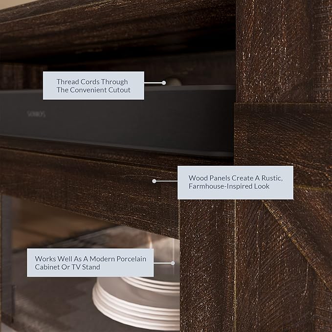 - [TECH-READY] This media cabinet is crafted with several cable cutouts, allowing you to keep your cords tangle-free and hidden away. There is plenty of space for all of your gadgets, including video game consoles, speakers or a DVD player.