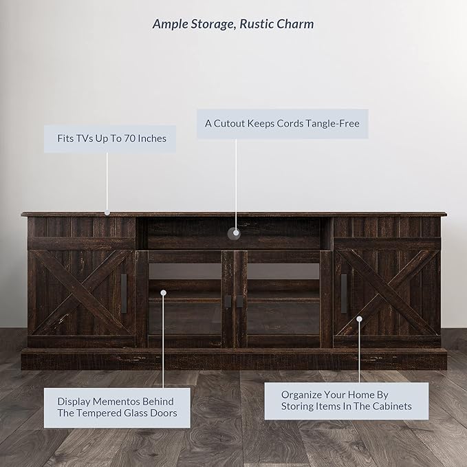 - [TIMELESS STYLE] This sophisticated, farmhouse-inspired entertainment center brings timeless style to a living room, dining room or entryway. Slat details on the doors create rustic charm and add a touch of industrial flair. This piece works well as a TV stand and holds a TV up to 70 inches.