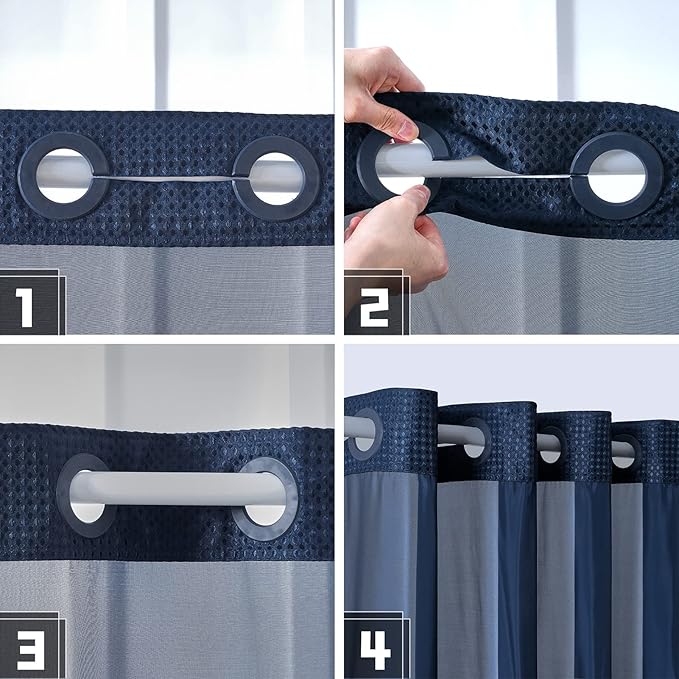 - Hotel Quality Shower Curtain: This no hook honeycomb textured fabric shower curtain with a snap-on liner set creates a hotel-inspired bathroom. You will love the outlook of the shower curtain and the fabric inner liner. The outer layer featured waterproof material to keep water quickly dry.