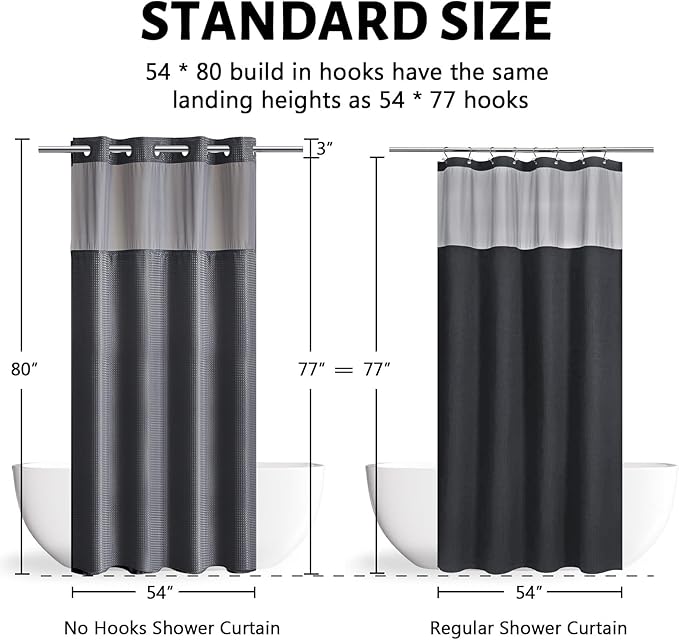 - Product Dimensions: This no hook shower curtain measures 54" width x 80" length that fits most bathtub and showers. It also comes with a detachable liner of 54"W x 60"L that is removable, easy to clean and machine washable