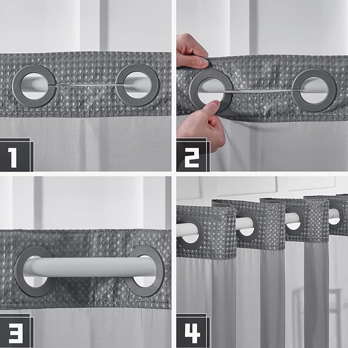 - Hotel Quality Shower Curtain: This no hook honeycomb textured fabric shower curtain with a snap-on liner set creates a hotel-inspired bathroom. You will love the outlook of the shower curtain and the fabric inner liner. The outer layer featured waterproof material to keep water quickly dry.