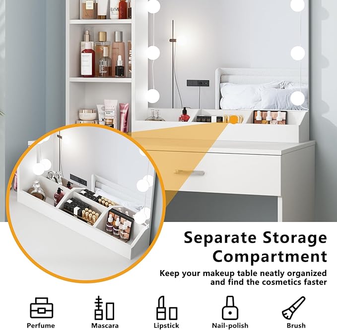 - Large Mirror with Adjustable Lights: Big HD mirror make sure you look great from every angle(Mirror size: 23.6" x 21.1"H).Equipped with 10 LED bulbs that Brightness adjustable,available in 3 colors: cool white, warm white and warm yellow,this make up desk can meet your different makeup needs.