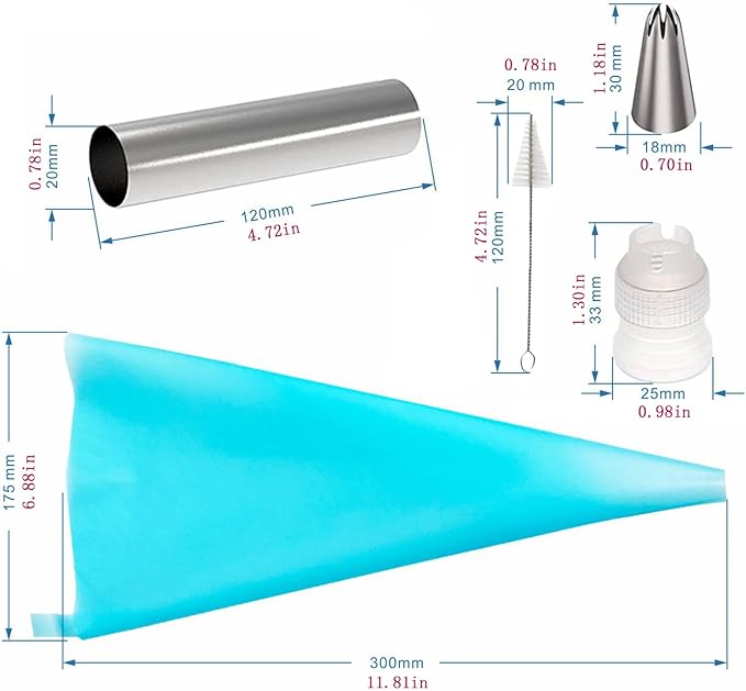 - Package include: 12 pieces of tube shape baking molds, 1 piece of cleaning brush, 1 piece of coupler, 6 pieces of Piping Tip, and 1 piece of reusable piping bag.