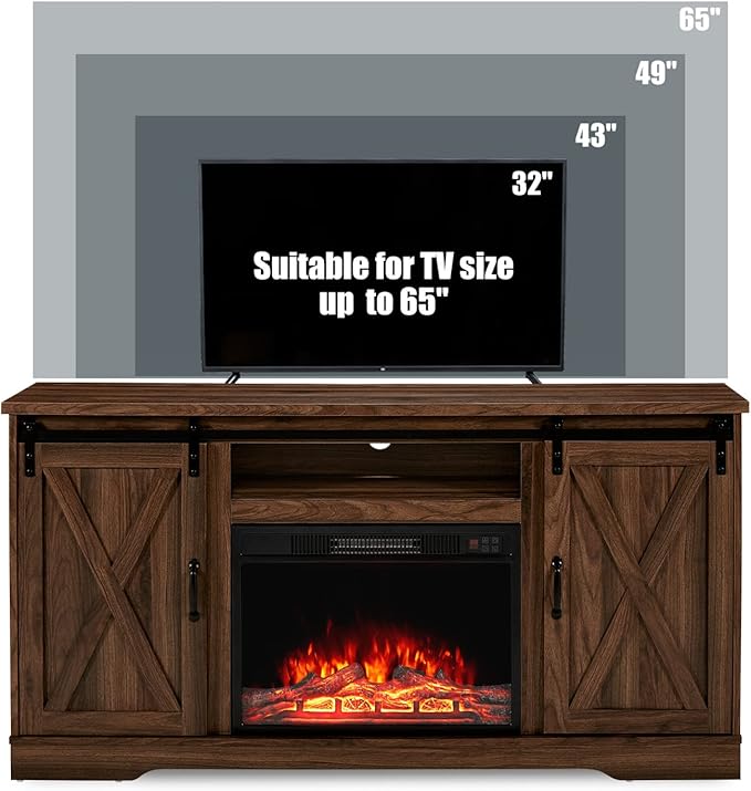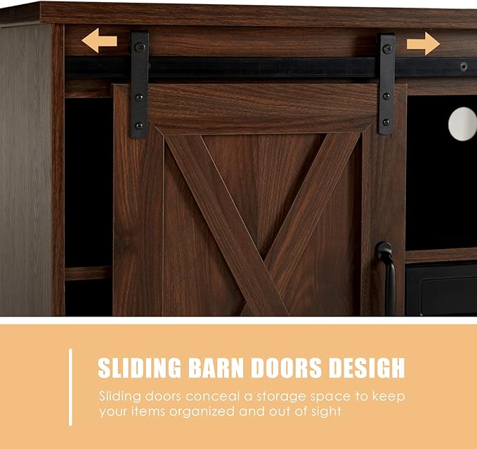 - 【Sliding Barn Door】Fireplace TV stand barn door design upgrading the decoration style. The two sliding barn doors glide smoothly along door track hardware to keep storage hidden or reveal home accents you wish to show off.A Built-in Magnet to Insure the door stays open during the electric fireplace operation.