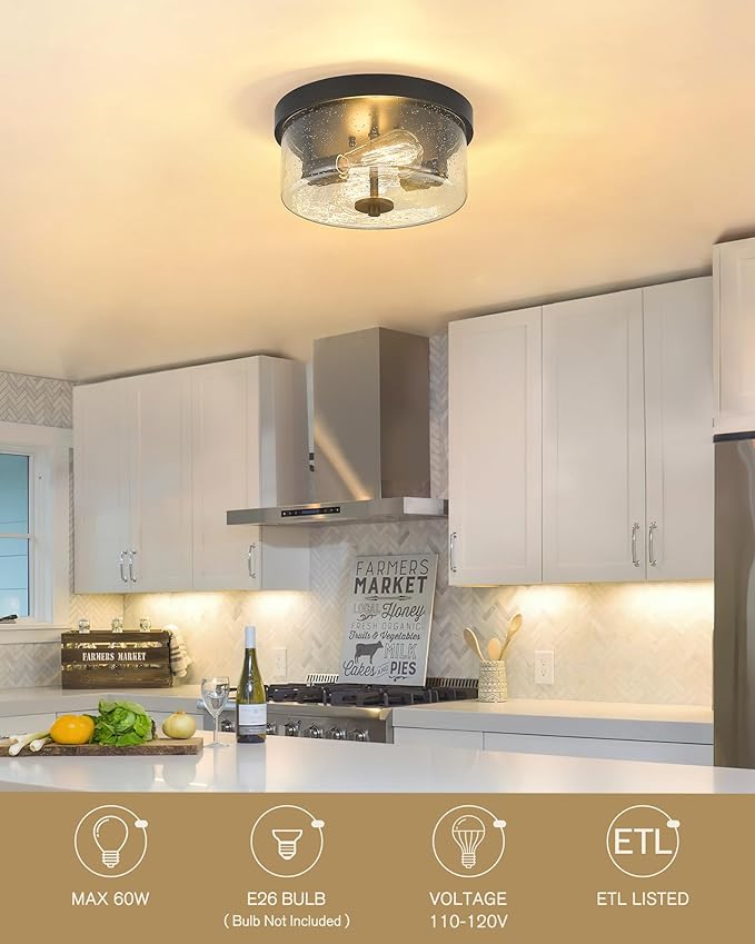 - [BULB REQUIREMENTS] This seeded glass light fixtures ceiling mount requires 2 x E26 base bulb, 60W max. Fully dimmable when used with a dimmable bulb and dimmer switch (bulb and dimmer switch not included).