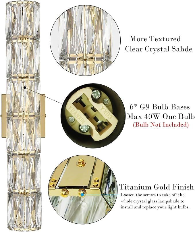 - Requirement of Bulb: This gold crystal sconce light is compatible with 6* G9 base bulbs, max 40W each bulb, recommended maximum bulb height: 2.5". Dimmable with using dimmer switch (Not included) and dimmable bulbs for meeting your different needs. (Note: Bulbs Not Included)