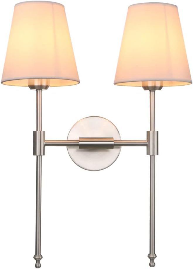 PERMO Classic Transitional Double Sconce 2-Lights Wall Sconce Lighting Fixture with Flared White Textile Lampshade and Brushed Nickel Finished Long Arm for Indoor Bathroom Bedroom Bedside