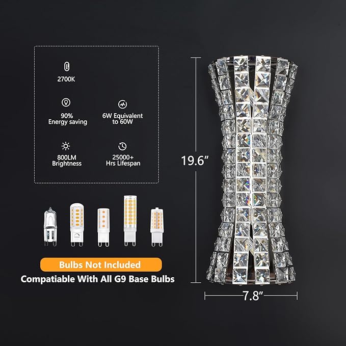 - 【Bulbs Requirement】This large luxury crystal wall sconce suitable for G9*6 Bulbs(Bulbs is not included).The unique crystal texture will reflects different light effects with dimmable bulbs.You could chose a dimmable bulbs if you want the sconce is dimmable.