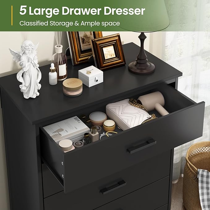 - Focus On Details - the 5 drawer dresser is made from premium engineered wood with a classic finish. The MDF material for a long-term use, scratch and waterproof, easy to clean. A wall anchor is included for added safety.