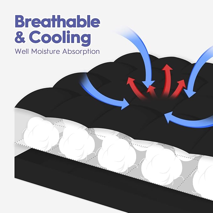- 【Ultra Thick & Breathable】: Our cooling mattress pad with thickened down alternative filling offers super elasticity and support, is fluffy and breathable, contributing to back pain relief and stress reduction. The cooling mattress cover filling with hollow fibers can increase air circulation and breathability, and carry away extra heat and perspiration. Providing a quiet and silent sleep for you,cloud-like comfort that will make you sleep like a baby