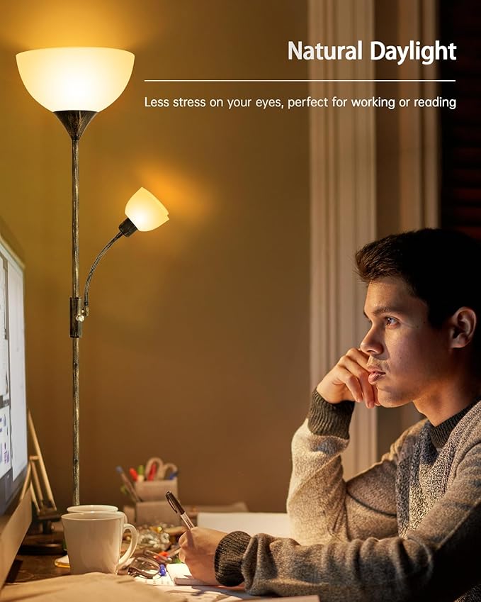 - 【Decorative Floor Lamp with 2 heads】With the unique bronze finish design, BoostArea 12W torchiere floor lamp comes with a 4W flexible side reading light, the gooseneck allows you to adjust angles to illuminate your projects, like reading, working or daily use; Emitting 2700K warm white light, the Eye-caring floor standing lamp will not harm your eyes; Also, with the 3-way rotary switch, you can choose seperate lights or both ON/OFF according to different needs