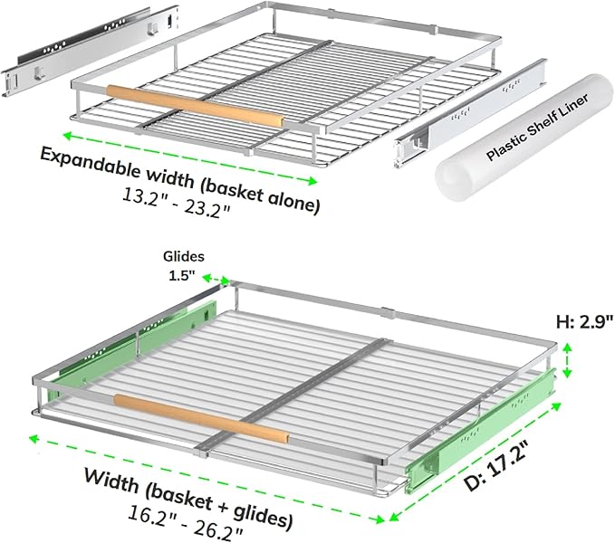 - EXPANDABLE DESIGN: This pull out cabitnet shelf is designed to fit in most cabinets. The width of the wire basket can be adjusted from 16.2“ to 26.2”. The new expandable design gives you a better experience and saves your space