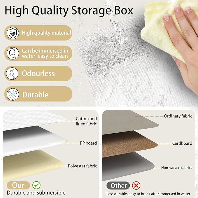 - Material: The storage containers are supported by pp board to ensure a rigid structure, no odour and allows storage box to be washed when it gets dirty, With inner surface of oxford cloth, much more sturdy and durable