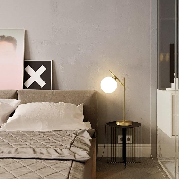 Mid Century Modern Table Lamp, 1 Light Brass Glass Globe Bedside Lamp, Contemporary Metal Table Lamp with Milky White Glass shadefor Bedroom Living Room Study Room