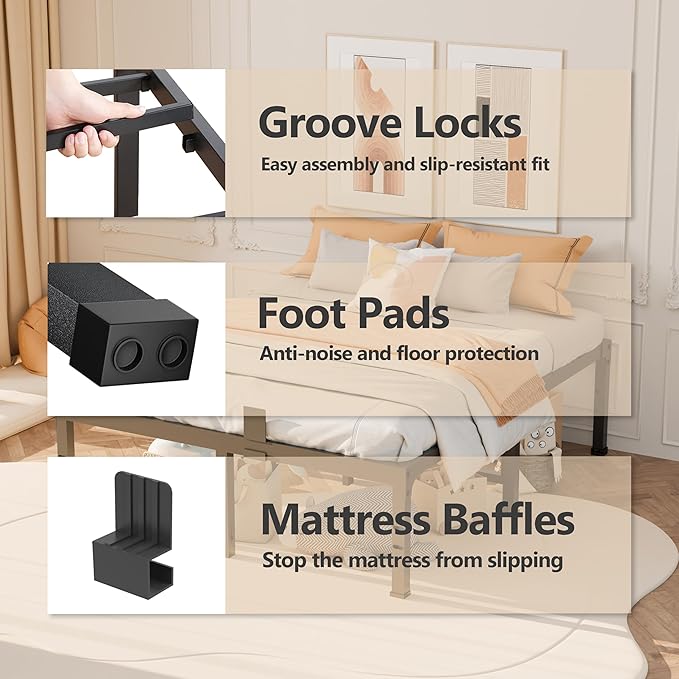 - Special Feature : 12.6 inch Under-bed Storage Space, Anti-slip Mattress Stopper, No Box Spring Needed, Reserved Headboard Holes and Noise-free Rubber Pads, Squeak Resistant 12.6 inch Under-bed Storage Space, Anti-slip Mattress Stopper, No Box Spring Needed, Reserved Headboard Holes and Noise-free Rubber Pads, Squeak Resistant