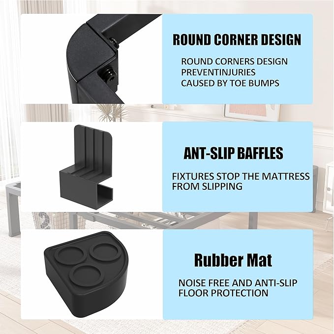 - Special Feature : 12.6 inch Under-bed Storage Space, Anti-Slip and Noise-free Rubber Pads, No Box Spring Needed, Round Corner Legs, Squeak Resistant 12.6 inch Under-bed Storage Space, Anti-Slip and Noise-free Rubber Pads, No Box Spring Needed, Round Corner Legs, Squeak Resistant