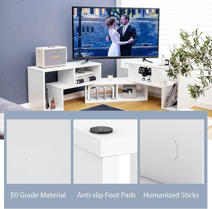 - 3PCS TV Console for Combination: This adjustable TV Stand consists of 2 L-shaped shelves and a rectangular shelf, which can be combined at will. The shelves can also be combined and rotated freely to form different angles. You can DIY the unique combination to fit well with your room configuration.