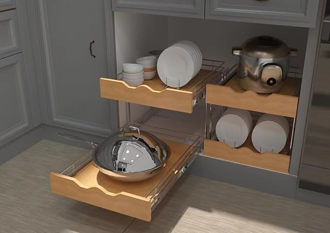 - 2 Tier Pull Out Cabinet Organizer With Wood Bottom combines the beauty of wood materials and the firmness of a metal wire basket, presenting an elegant outlook. Each layer can be pulled out separately, making use of space more flexibly.