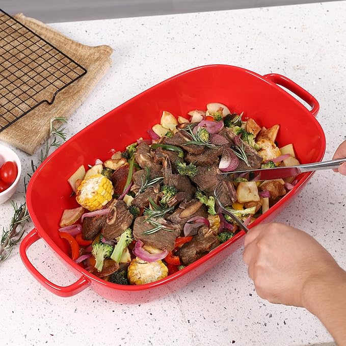 - Durable and Easy to Clean: This baking dish has a elegant look and safe-grade glaze with highly smooth scratch resistance,is stain resistant and easy to clean.Durable and safe for every day use in your oven, microwave, freezer, dishwasher.And amphora handle is safer and resistant to temperature changes makes it easier to take, saving space and storage on kitchen.