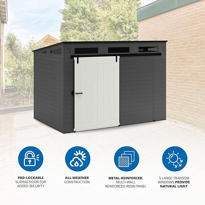 Suncast Modernist 10 Foot by 7 Foot Outdoor Plastic Storage Shed with Pad Lockable Sliding Barn Door for Outdoor Storage Items, Gray and Black
