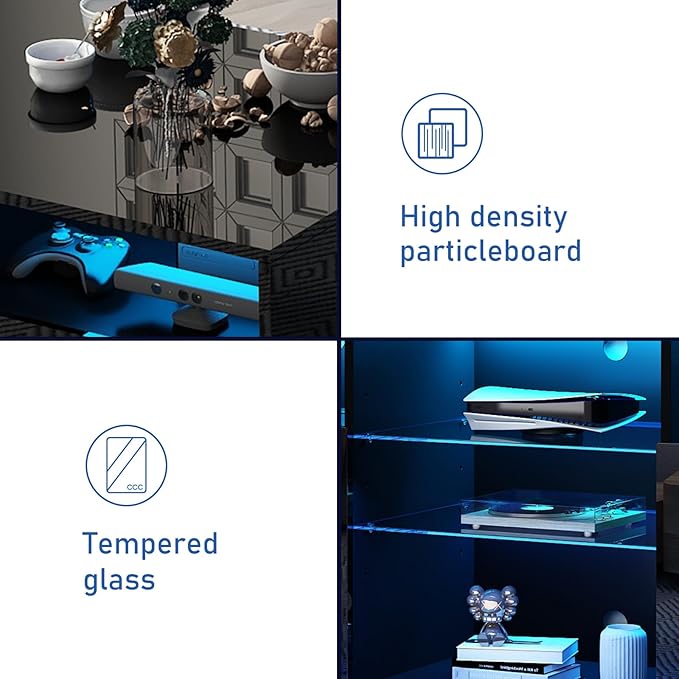- 【5-Level Height-Adjustable Shelves】The 3 tempered glass shelves can be adjusted with 5 height levels. Gaming TV stand with large storage can be used to store game consoles, media, magazines, DVDs, remote controls and decorative ornaments. Make full use of the space, keep your living room clean and tidy, and prevent you from missing items.