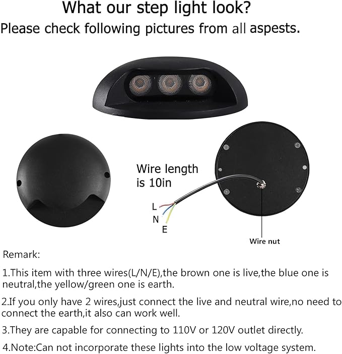 - Voltage:Our line voltage outdoor step lights can work with 110V 120V wiring directly, No additional transformer required.Note:Can not incorporate these lights into the low voltage system.