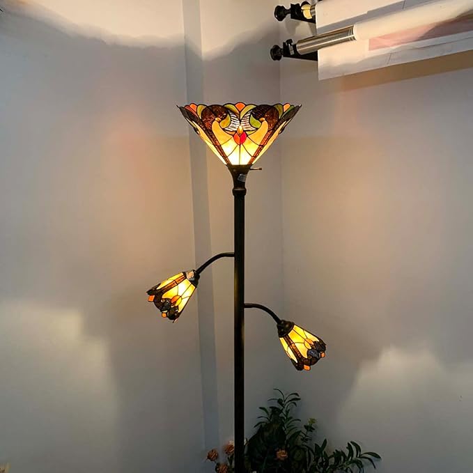 Bieye L10839 Baroque Tiffany Style Stained Glass Torchiere Floor Lamp with Sidelights for Reading, 70-inches Tall (Baroque, Brown)