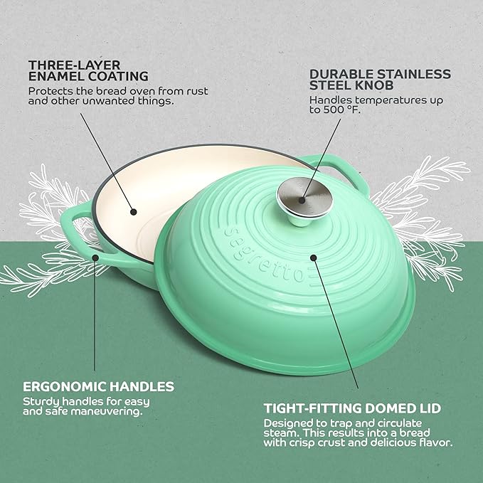 Enameled Cast Iron Bread Pan with Lid 11” Green Bread Oven Cast Iron Sourdough Baking Pan, Dutch Oven for Bread, No Seasoning Needed-Segretto Cookware