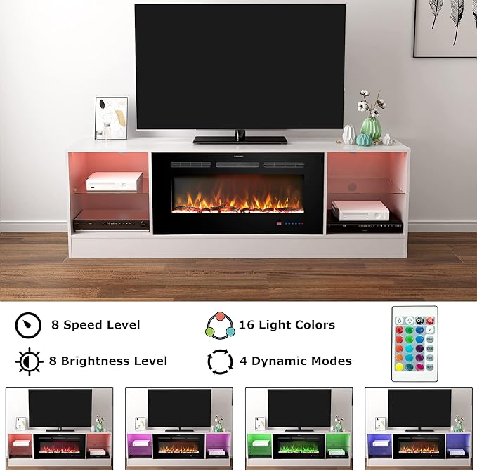 - [Modern & Simplicity] Fireplace TV stand with brief and solid color design, suitable for kinds of style room. Holes in the back allows to manage and hidden messy wires, keeps all items orderly. Attractive and modern electric fireplace provides warmth while bringing you visual enjoyment. It's a best choice for bedroom, living room, guest room and so on.
