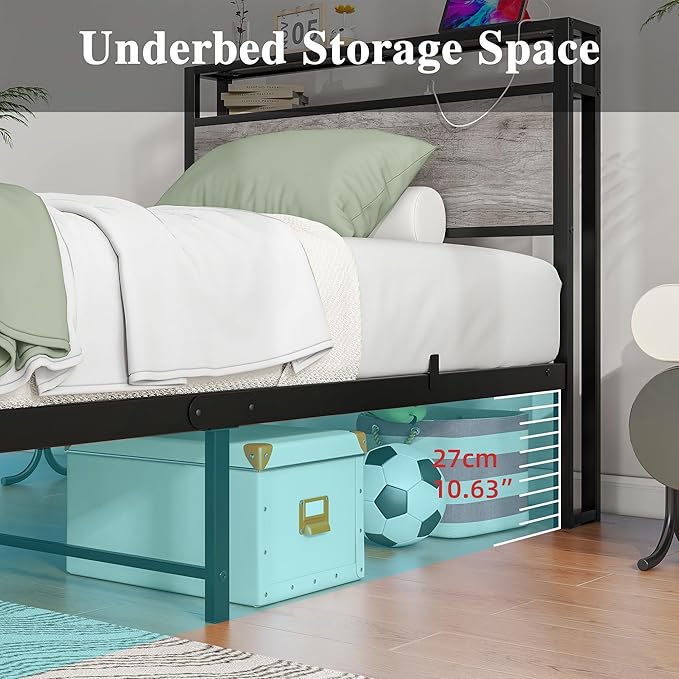 - 【Twin bed frame with storage】The Metal bed frame with 2 tier storage shelves headboard equals nightstands,makes mobile phones, glasses, books, coffee cups, chargers, etc. within easy reach. The under-bed storage space is easy to collect luggage, shoe cases, and some storage boxes and the sweeping robot can easily pass through and keep your bedroom clean and tidy.