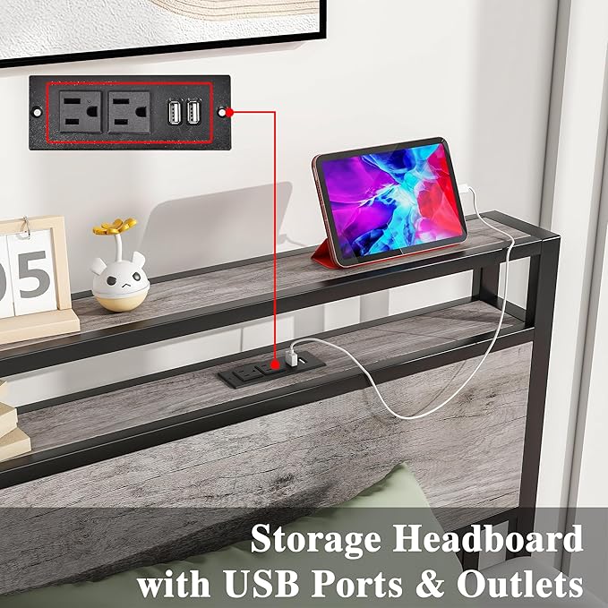 - Special Feature : 2 Tier Storage Headboard, No Box Spring Needed, Squeak Resistant, USB Port