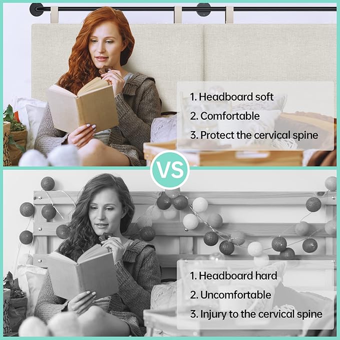 - 【Stable Frame & Soft Edge】Queen size headboard can supported by durable solid wood plywood frame, our headboard features outstanding toughness and bending resistance for long-lasting use. All sides are wrapped with soft edges for higher security. Additionally,The metal rails hang headboard further enhance stability.