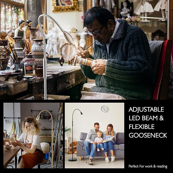 - Modern Design- The slim profile of this standing spotlight offers a minimalist feel. Stand the lamp straight up or create an arch to bring an artistic look to your space. Ray is perfect for adding additional beams to highlight focal points of a room or to focus in on close up projects. The metal finish creates a polished look across all colors, antique brass, brushed nickel and black.