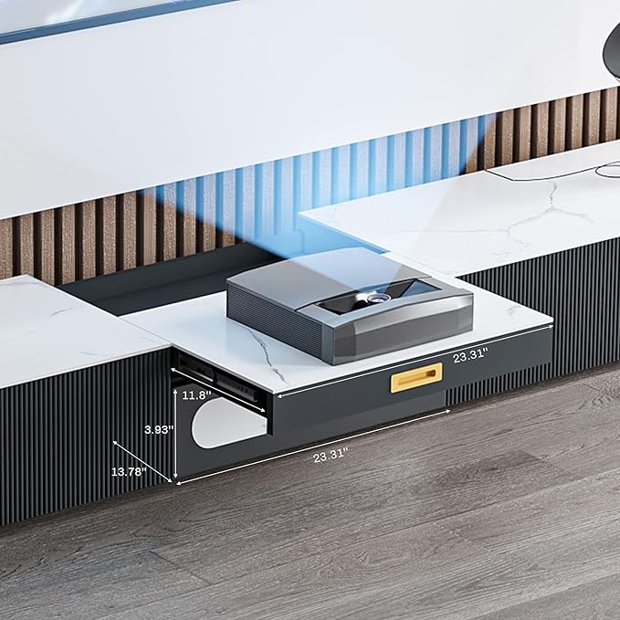 - Innovative Projector Integration: This TV stand isn't just for holding your TV (up to 85"); it's a complete entertainment solution. With a slide-out tray designed to accommodate a projector, simply pull it out when needed and enjoy a cinematic experience on a screen of up to 150 inches in your living space.
