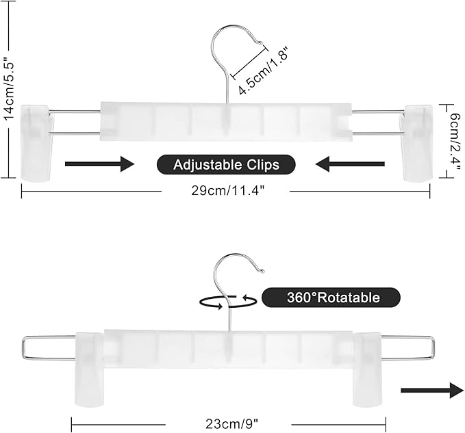 - 【Excellent design】: Our trousers hangers are very versatile, the stainless steel hooks can be rotated 360 degrees and can be hung in various positions, the hanger has removable clips at both ends, which can be adjusted from 21 cm to 28 cm, not only suitable for adult clothes, but also For children's clothing, in addition, the clips has a non-slip design, which can firmly hold your clothing and prevent it from falling
