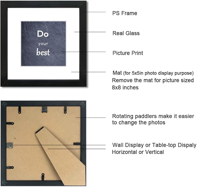 - EXQUISITE DESIGN: 3 Pack picture frames in the same size. Perfect for pictures 5x5 with Mat or 8x8 Without Mat. An ideal house warming gift for your new home or office.