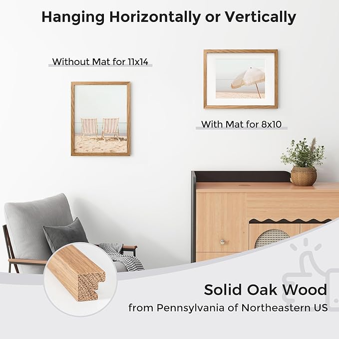- Highest Quality OAK Materials: Our 11'' by 14'' natural wood frame made of 100% white oak wood, comes from Pennsylvania of Northeastern US, is the most widely used timber;because the excellent texture, long-lived durable characteristics, becomes the one of the most popular woods in home decor, and due to the grain pattern, suitable various kinds of decoration style