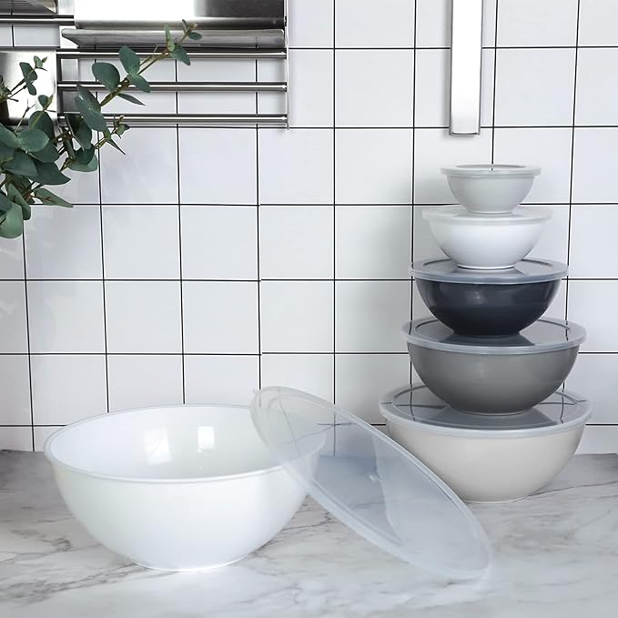 BoxedHome BPA Free Plastic Round Mixing Bowl with Lids, 12 Pack Nesting Bowls with Lids Set, Microwave and Dishwasher Safe Prep & Serving Bowls Great for Mixing, Baking, Serving (White, 12pcs)