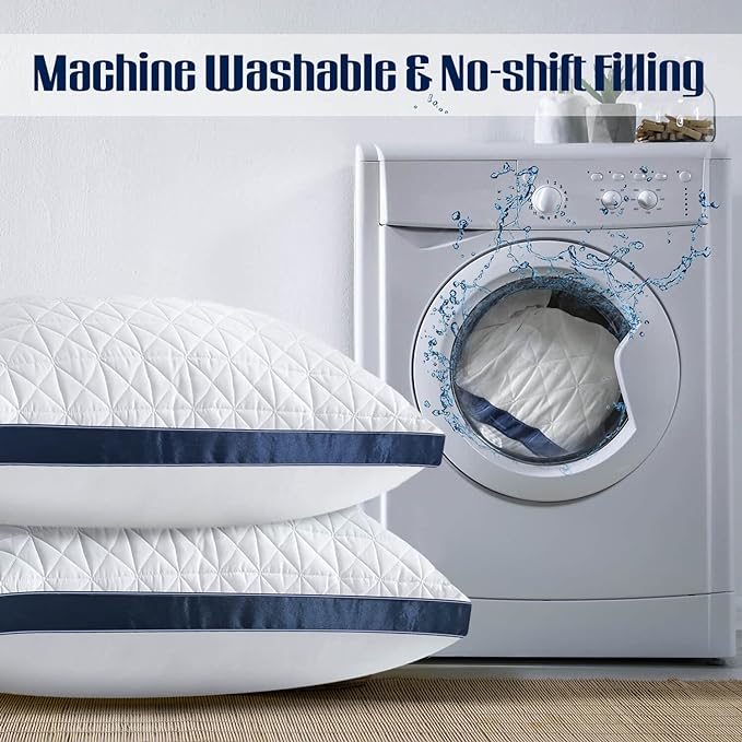 - EXQUISTE DETAILS PILLOWS: Our Pillows are added quilted embossing on front side, it embossed with extra filling to make it more plush, other side is normal side, you will have two choice for your prefer side. Double piping craft with sapphire blue gusseted band design not only give a better look, but also helps hold it's plush shape, won’t flatten out after longtime use. Each details are aim to maximizing its‘ comfort and improving your sleeping experience