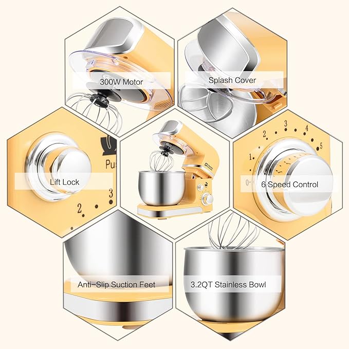 - 3.2Qt Capacity and Tilt Head Design - Our little kitchen mixer equipped with 3.2Qt stainless steel bowl,suitable for new baker,1-2 members family or couples,easy to operate and clean up.Tilt-head design mixer allows access to install or uninstall bowl and accessories easily.And transparent anti-splash lid could prevent the ingredient making a mess.