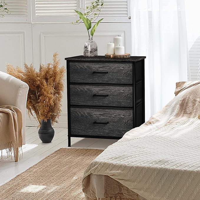 - Spacious Storage: The 3 fabric drawers of the small dresser offer large storage space for nighttime necessities with Each drawer is approximately 8 inches deep. The wood top is ideal to place alarm clock, phone, charger, eyeglasses, keeping them in your reach.