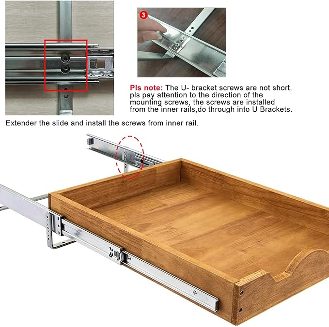 - Effortless Installation. No measurement is required at all, with our step-by-step manual, plus the mounting template that helps align with the cabinet floor. The U-brakets screws are not short, pls pay attention to the direction of the mounting screws, the screws are installed from the inner rails. Watch the Amazon installation videos if you have any questions, they explain it all.