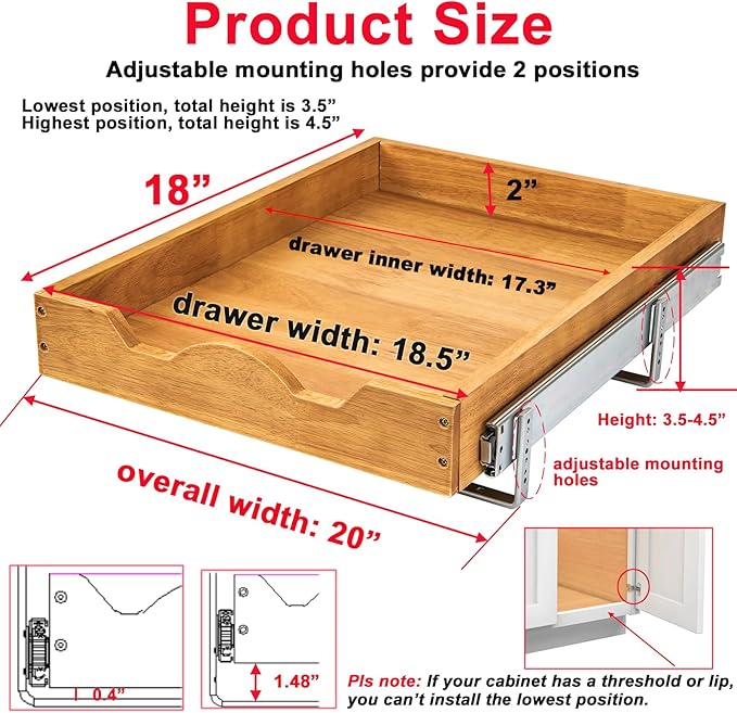 - This wood pull out shelf overall size is 18" D x 20"W, the drawer size is 18"D x 18.5"W x 2"H. Requires more than 20 " W net width cabinet opening, net width measure from the hinge. Min cabinet deepth at least 19.5 inch Measure your cabinet and choose the right size before making your decision, Our pull out organizers just be installed by bottom mount, not by side mount.